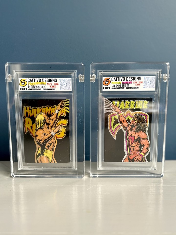 These are my custom 1/1 collector cards from the Cattivo Designs Legends Series. Hulkamania on one side. The Ultimate Warrior on the other. Both capturing that unforgettable pose from the moment the two icons collided.